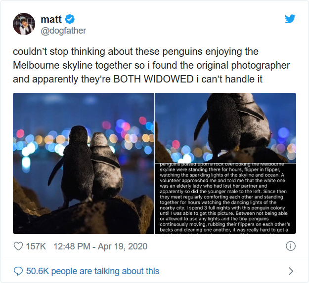 The original poster wrote: “Couldn’t stop thinking about these penguins enjoying the Melbourne skyline together so I found the original photographer and apparently they’re BOTH WIDOWED I can’t handle it.”