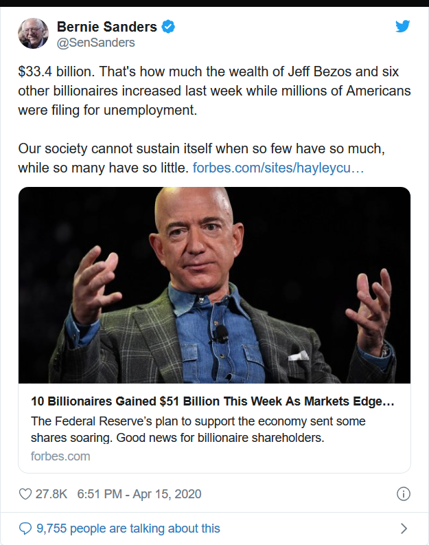 Sen. Bernie Sanders (I-Vt.), a longtime labor rights advocate and foe of millionaires and billionaires, tweeted the Forbes report Wednesday and highlighted how the wealth increases of Bezos and other billionaires contrast with the millions of Americans who have lost their jobs because of the ongoing public health crisis.