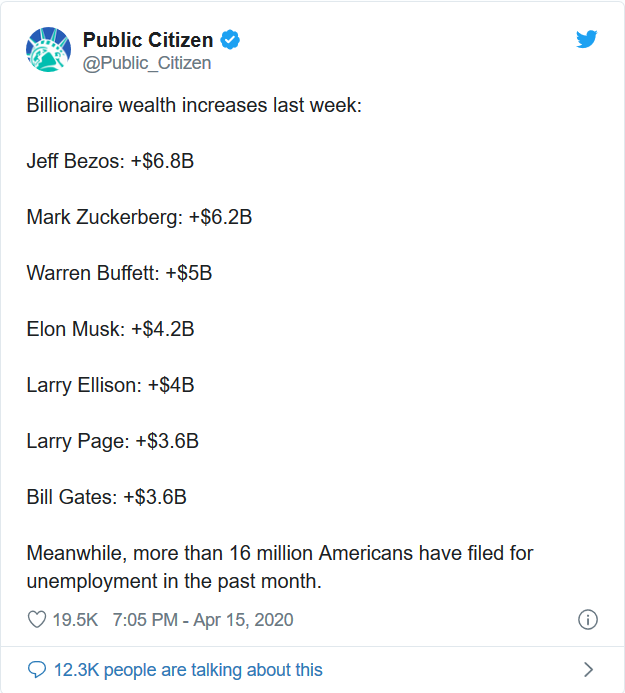 That contrast between U.S. billionaires and the nation’s newly unemployed was also pointed out on Twitter Wednesday by Public Citizen, which cited the Forbes report.